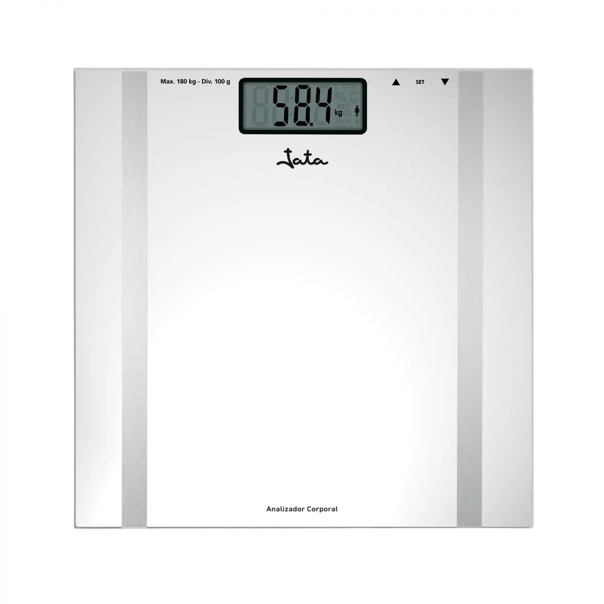 Báscula inteligente de la marca Jata modelo 532 que mide peso y composición corporal, con memoria para 12 usuarios y capacidad de hasta 180 kg.