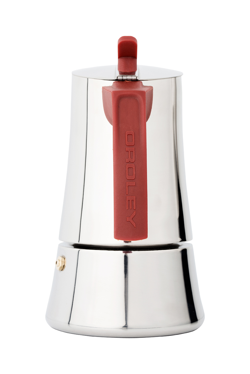 Cafetera italiana de acero inoxidable para 10 tazas, diseñada para funcionar en todo tipo de cocinas (incluso inducción) con mango ergonómico que no se sobrecalienta.