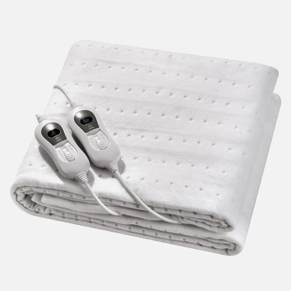 Calientacamas doble en color blanco, ideal para cama de 160×140 cm, con madera acogedora, doble mando independiente y apagado automático.