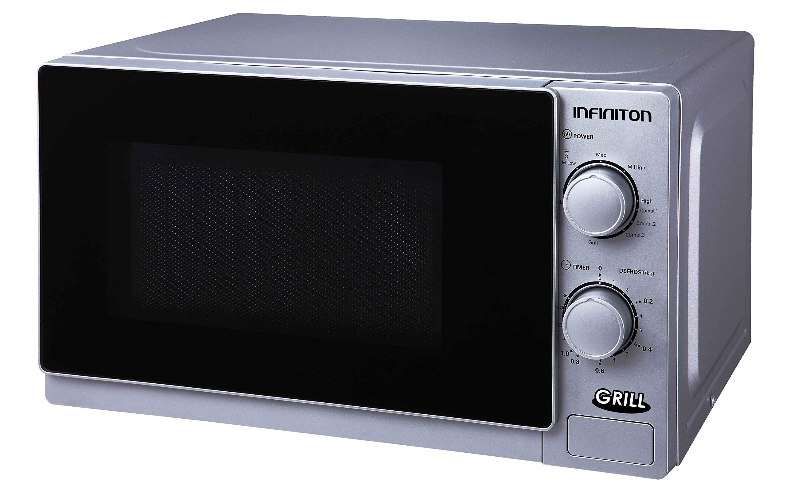 El Infiniton MW-1121A es un microondas de diseño moderno y acabado en color plata, ideal para cocinas pequeñas o para quienes buscan un electrodoméstico práctico y funcional.