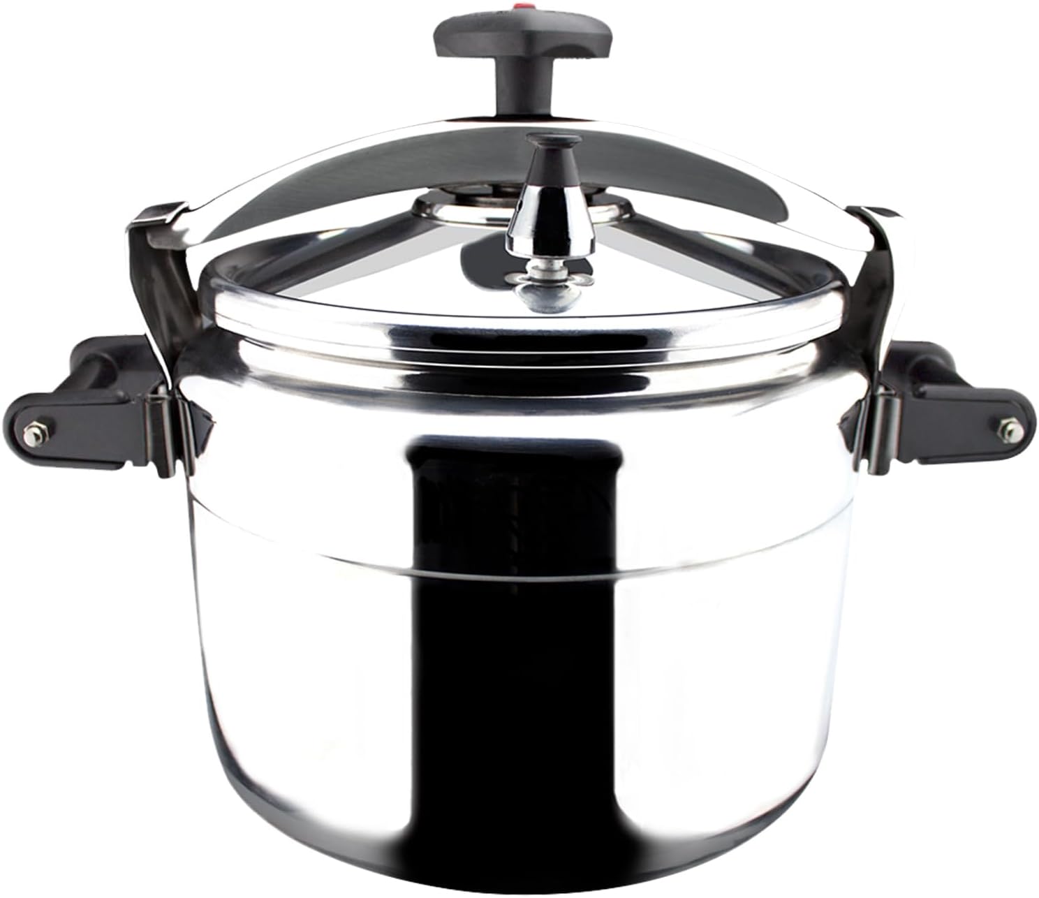 Olla a presión profesional de 15 L en aluminio, compatible con múltiples fuegos y con 3 sistemas de seguridad para cocinar rápido y de forma segura.