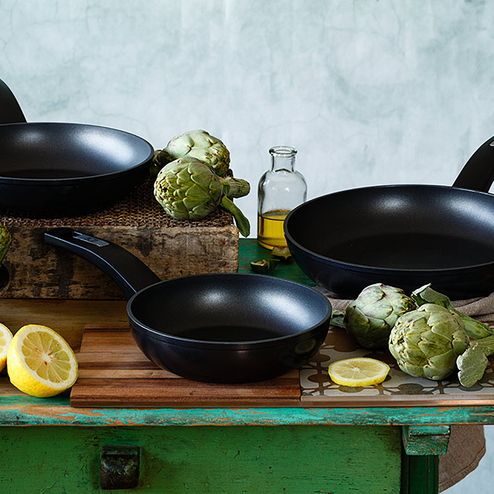 Set compuesto por 3 sartenes antiadherentes fabricadas en aluminio forjado que aporta resistencia y unos perfectos resultados gracias a su antiadherente libre de PFOA.