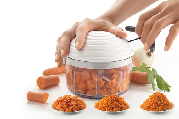 Picadora manual de verduras y frutas con sistema giratorio que permite cortar y picar rápidamente sin necesidad de electricidad.
