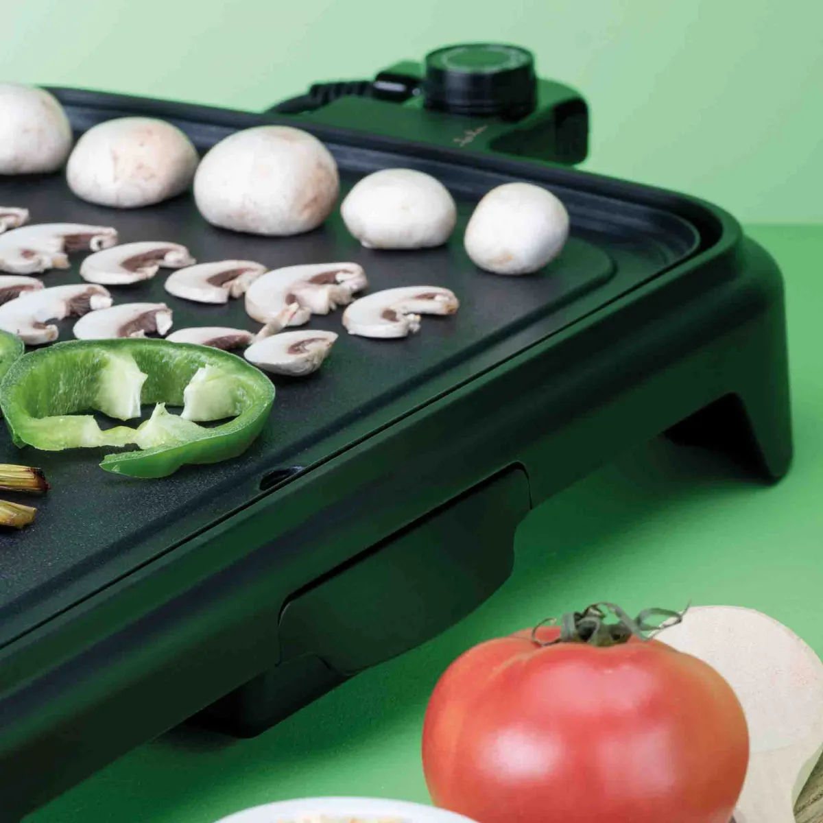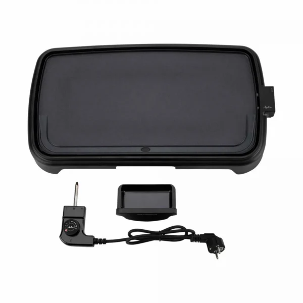 Plancha de asar Jata JEGR1241 con gran superficie, revestimiento antiadherente y resistencia en “M” para un calentamiento uniforme. Ideal para cocinar de forma saludable y sin grasas.