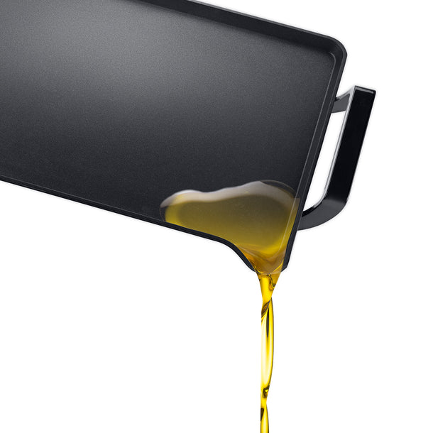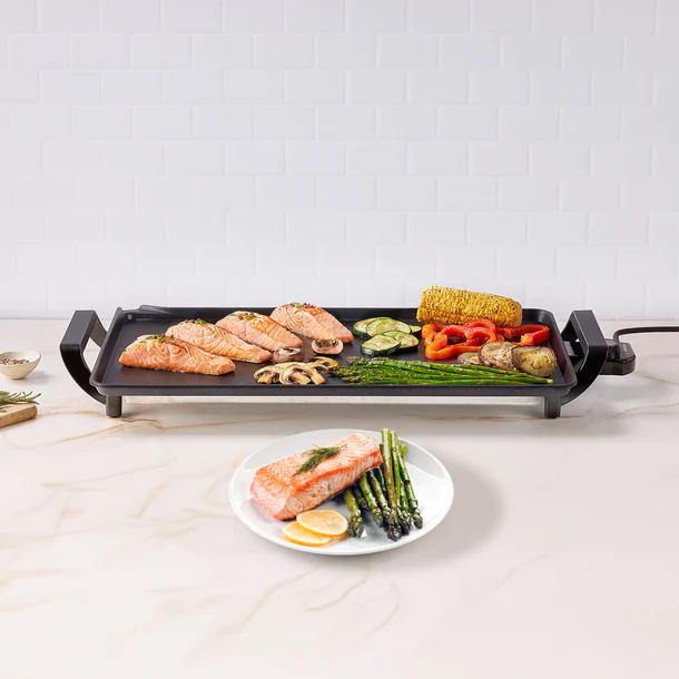 Una plancha eléctrica de 2 500 W con amplia superficie de cocción, diseñada para cocinar de forma rápida, fácil y saludable.
